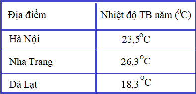 Dựa vào bảng số liệu dưới đây, em hãy tính nhiêt độ trung bình năm của Hà Nội, Nha Trang, Đà Lạt: