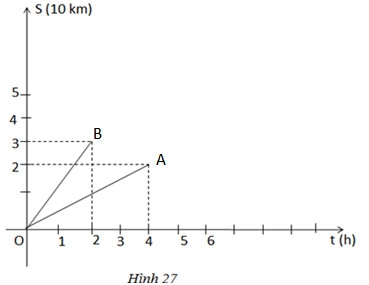 Trong hình: Đoạn thẳng OA là đồ thị biểu diễn chuyển động của người đi bộ và doạn thẳng OB là đồ thị biểu diễn chuyển động của người đi xe đạp. Mỗi đơn vị trên trục Ot biểu thị một giờ, mỗi đơn vị trên trục OS biểu thị 10km. Qua đồ thị, em hãy cho biết: