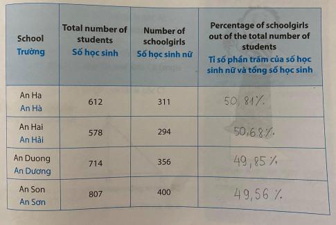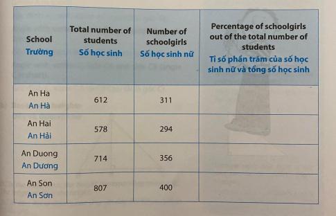 Trong bảng sau, cột cuối cùng ghi tỉ số phần trăm của số học sinh nữ và tổng số học sinh của một trường. Hãy dùng máy tính bỏ túi để tính và viết kết quả vào cột đó.