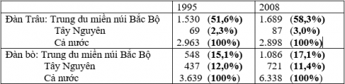 Dựa và vào bảng số liệu, hãy tính % và điền tiếp vào bảng dưới, sau đó vẽ biểu đồ thể hiện quy mô đàn trâu, bò của cả nước và cơ cấu của chúng phân theo vùng năm 1995 và 2008.
