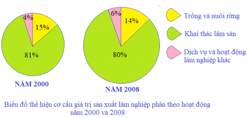 Vẽ biểu đồ thể hiện cơ cấu giá trị sản xuất lâm nghiệp phân theo hoạt động năm 2000 và năm 2008
