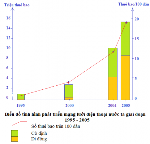 Căn cứ vào bảng số liệu đã cho, hãy vẽ biểu đồ kết hợp giữa đường và cột thể hiện tình hình phát triển mạng lưới điện thoại của nước ta trong giai đoạn 1995 – 2005.