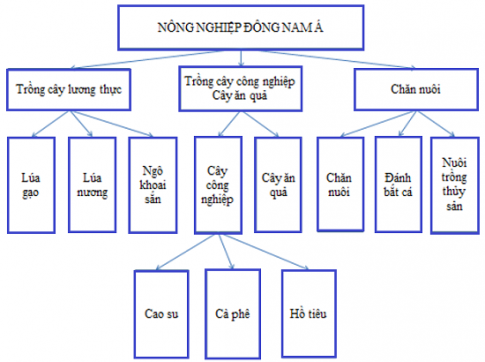Điền tiếp vào ô trống và nối gạch nối vào sơ đồ thể hiện cơ cấu ngành nông nghiệp khu vực Đông Nam Á sao cho hợp lí: