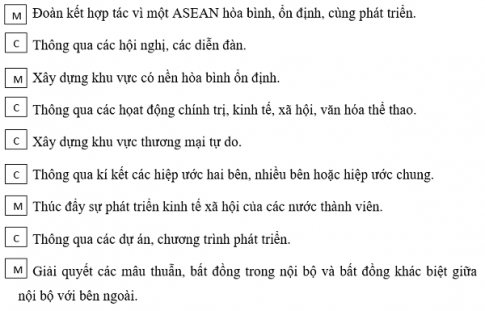 Lựa chọn để điền chữ M (mục tiêu) hoặc chữ C (cơ chế hợp tác) vào ô trống ý em cho là đúng.