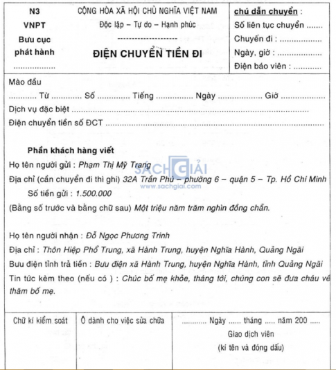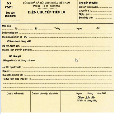 Mẹ muốn gửi gấp về quê một số tiền để ông bà sửa bếp. Em hãy giúp mẹ điền những điều cần thiết vào bức điện chuyển tiền đi dưới đây: