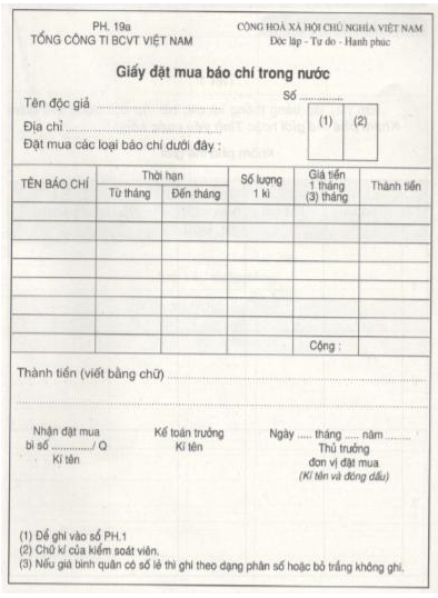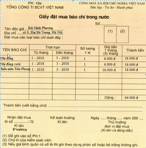 Em đi đặt mua một số báo chí cho mình và cho ông bà, bố mẹ. Hãy điền những nội dung cần thiết vào giấy đặt mua báo chí dưới đây: