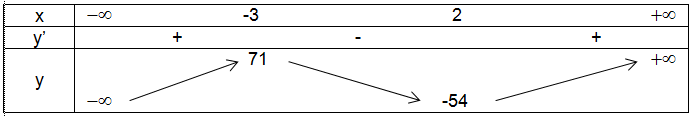 Dựa vào bảng biến thiên ta có hàm số đạt cực đại tại x=-3 và đạt cực tiểu tại x=2. Đồ thị hàm số có điểm cực đại là (-3;71) và điểm cực tiểu (2;54).