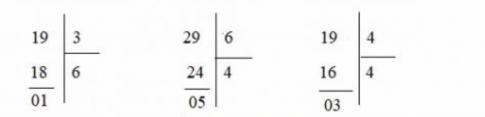 Viết: 19 : 3 = 6 ( dư 1) Viết: 29 : 6 = 4 ( dư 5) Viết: 19 : 4 = 4 ( dư 3)