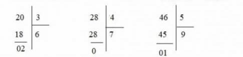 Write: 20 : 3 = 6 Write: 28 : 4 = 7 Write: 46 : 5 = 9