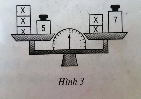 Ta thấy bên trái cân có 3 quả cân có khối lượng x và 1 quả cân có khối lượng là 5.