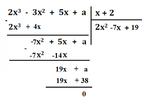 - 3x$^{2}$ + 5x + a chia hết cho đa thức x + 2 thì (19x + a) – (19x + 38) = 0.