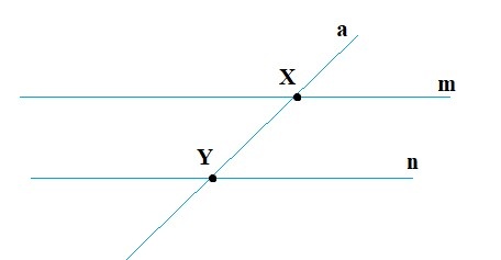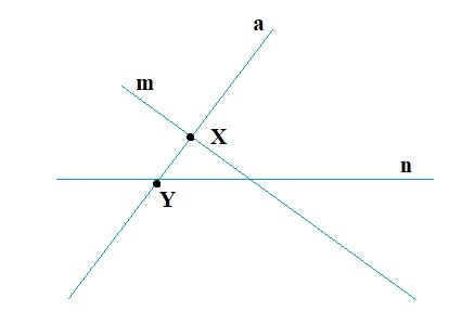 b) Đường thẳng a cắt hai đường thẳng m và n theo thứ tự tại X và Y trong hai trường hợp m và n cắt nhau, hoặc m và n song song với nhau
