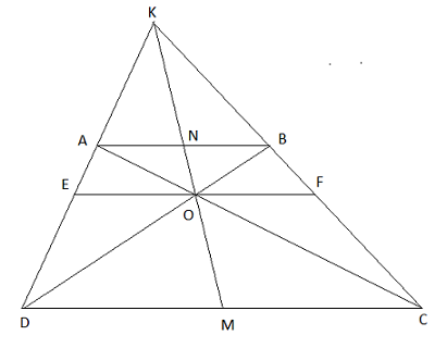 Hình thang ABCD (AB // CD) có AC và BD cắt nhau tại O, AD và BC cắt nhau tại K. Chứng minh rằng OK đi qua trung điểm của các cạnh AB và CD.
