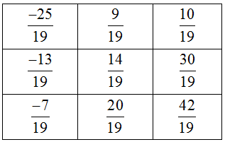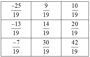 ; cột thứ 3 điền \({{30} \over {19}};{{42} \over {19}}\) hoặc dòng thứ 2 điền \({{14} \over {19}}\) và \({{20} \over {19}}\) dòng thứ 3 điền \({{30} \over {19}};{{42} \over {19}}\)
