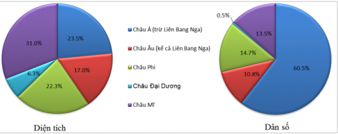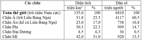 - Tiếp đến là châu Mĩ, Châu Phi và châu Âu (kể cả Liên Bang Nga) chiếm tỉ trọng diện tích tương đối lớn những tỉ trọng dân số tương đối thấp.