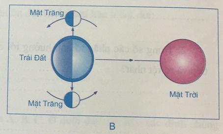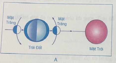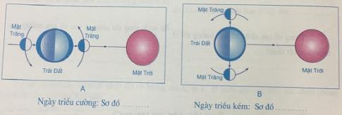 Từ hai sơ đồ A và B dưới đây, em hãy xác định sơ đồ nào thể hiện ngày triều cường và sơ đồ nào thể hiện ngày triều kém?
