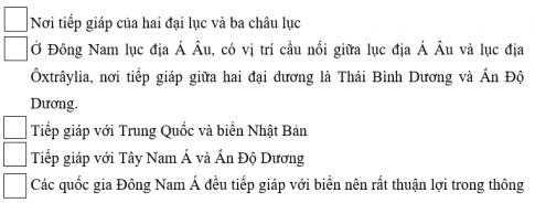 - Em hãy đánh dấu vào ô trống ứng với ý em cho là đúng, khi nói về vị trí địa lý của Đông Nam Á
