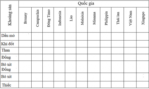 - Đánh dấu X vào bảng thể hiện sự phân bố các khoáng sản chính ở khu vực Đông Nam Á