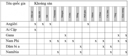 Dựa vào trang kí hiệu chung và lược đồ trên, em hãy điền vào bảng sau tên các quốc gia giàu tài nguyên khoáng sản ở Châu Phi và đánh dấu X vào các cột khoáng sản của các quốc gia đó.