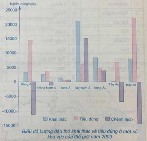Dựa vào biểu đồ bên, điền số thứ tự vào đầu mỗi dòng để xếp hạng cán cân khai thác và tiêu dùng dầu mỏ của các khu vực cung cấp dầu thô cho thế giới: