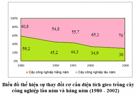 - Vẽ biểu đồ miền thể hiện sự thay đổi cơ cấu diện tích gieo trồng cây công nghiệp của nước ta phân theo cây hàng năm và cây lâu năm trong giai đoạn 1980 – 2008 (trước khi vẽ, hãy xử lí số liệu và điền vào bảng trên).