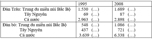Dựa và vào bảng số liệu, hãy tính % và điền tiếp vào bảng dưới, sau đó vẽ biểu đồ thể hiện quy mô đàn trâu, bò của cả nước và cơ cấu của chúng phân theo vùng năm 1995 và 2008.