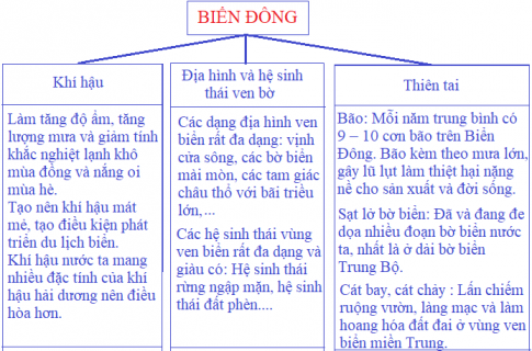 Hãy điền nội dung phù hợp vào sơ đồ dưới để nêu rõ ảnh hưởng và tác động của Biển Đông đối với thiên nhiên nước ta.