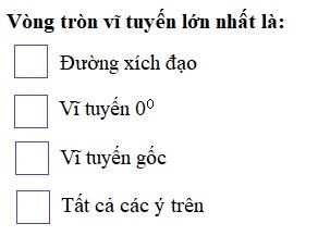- Những đường tròn trên quả Địa cầu nhỏ dần về hai cực và vuông góc với đường kinh tuyến là những đường............... Đường vĩ tuyến dài nhất trên quả Địa cầu có số độ là............. Đường này được gọi là...............