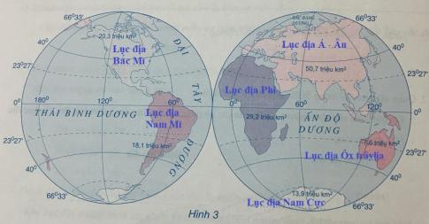 Dựa vào diện tích đã thể hiện trên bản đồ ở hình 3 (trang 18), em hãy điền tiếp tên các lục địa vào chỗ chấm (...) và cho biết: