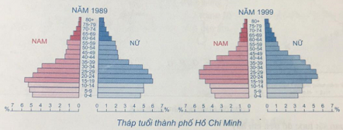 Quan sát tháp tuổi của thành phố Hồ Chí Minh năm 1989 và năm 1999, em hãy cho biết: