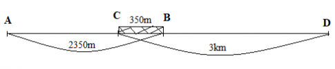 Đoạn đường AB dài 2350m và đoạn đường CD dài 3km. Hai đoạn đường này có chung một chiếc cầu từ C đến B dài 350m. Tính độ dài đoạn đường từ A đến D?
