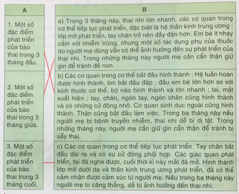 b. Sự hình thành và phát triển của bào thai trong bụng mẹ là: Trứng và tinh trùng gặp nhau tạo thành hợp tử. Hợp tử phát triển thành bào thai.