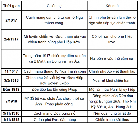 Hãy lập bảng niên biểu về các sự kiện chính của Chiến tranh thế giới thứ nhất theo yêu cầu sau và điền những nội dung thích hợp.