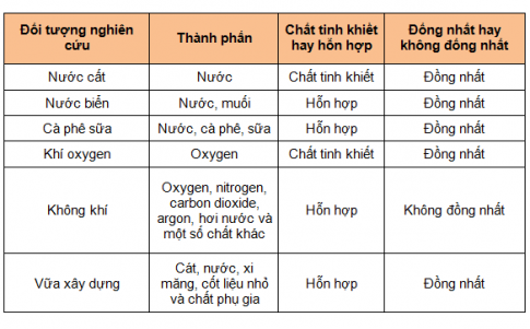 3. Cho các từ sau: chất tinh khiết; hỗn hợp; đồng nhất; không đồng nhất; oxygen; carbon dioxide. Xác định từ phù hợp để hoàn thành câu đưới đây:
