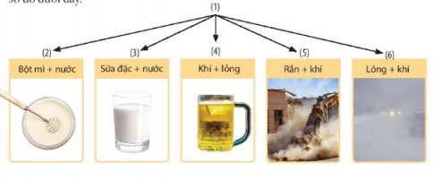 6. Cho các từ: hỗn hợp đồng nhất; hỗn hợp không đồng nhất; nhũ tương; huyền phù; dung dịch; sương; bụi; bọt. Chọn từ phù hợp điền vào các số tử (1) đến (6) trong sơ đồ dưới đây: