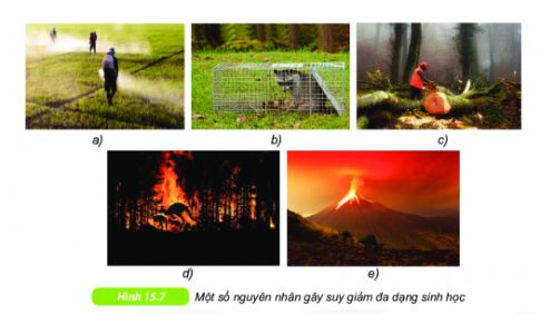 1. Quan sát hình 15.7 và nêu các nguyên nhân gây suy giảm đa dạng sinh học.