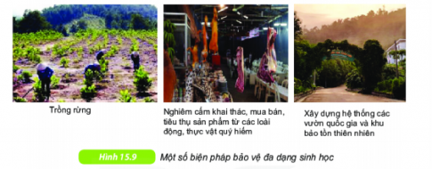 1. Quan sát hình 15.9, nêu các biện pháp bảo vệ đa dạng sinh học và tác dụng của mỗi biện pháp đó. Kể thêm các biện pháp khác.