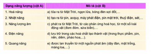 2. Hãy chọn tên dạng năng lượng (ở cột A) phù hợp với phần mô tả (ở cột B). Ví dụ 1 - d.