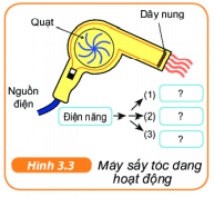 2. Hình 3.3 mô tả một máy sấy tóc đang hoạt động. Mũi tên trên sơ đồ dòng năng lượng cho thấy sự chuyển hóa điện năng thành ba dạng năng lượng khác.