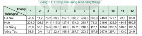 Bảng 1.1 cho biết lượng mưa trung bình hàng tháng (theo đơn vị mm) của hai năm 2017, 2018 ở một số địa phương (theo Tổng cục Thống kê).