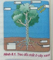 Dựa vào những hiểu biết của mình, hãy hoàn thành chú thích ở hình 8.1 và cho biết những chất được trao đổi giữa cây xanh với môi trường là gì?