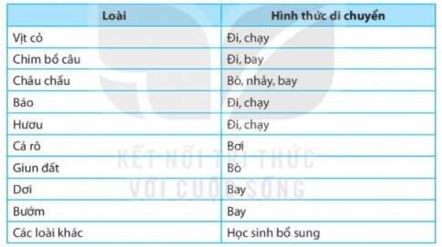 Câu 37.3. Cho tập hợp các sinh vật sau: vịt cỏ, chim bồ câu, châu chấu, báo, hươu, cá rô, giun đất, dơi, bướm, Hãy nêu hình thức di chuyển của các loài trên. Có thể bổ sung các loài khác em quan sát được cùng hình thức di chuyển của chúng.