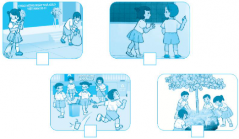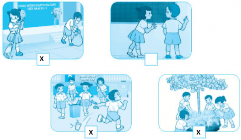 Bài 4. Đánh dấu X vào ô trống dưới hình thể hiện việc em nên làm để giữ gìn vệ sinh trường học. Giải thích tại sao em lại làm những việc đó.