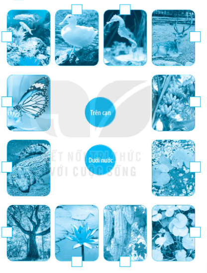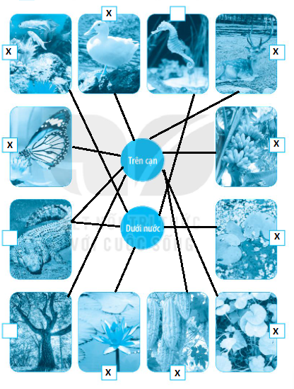 Bài 3. Nối mỗi hình cây, con vật dưới đây với cụm từ phù hợp. Đánh dấu X vào ô trống ở hình cây, con vật em đã từng nhìn thấy trong thực tế.