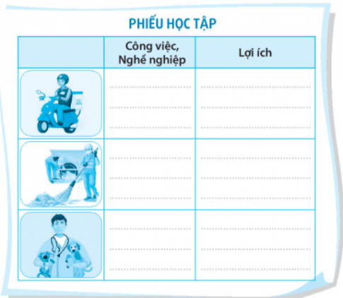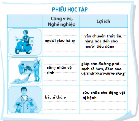 Bài 1. Hãy viết lợi ích của các nghề nghiệp, công việc trong mỗi hình vào chỗ (...) dưới đây.
