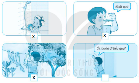 Bài 3. Đánh dấu X vào ô trống dưới các hình thể hiện những việc nên làm để chăm sóc, bảo vệ cơ quan bài tiết nước tiểu.