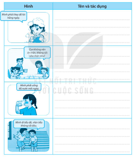 Bài 1. Viết vào chỗ (...) tên và tác dụng của các việc làm để chăm sóc, bảo vệ cơ quan bài tiết nước tiểu được thể hiện trong mỗi hình sau.