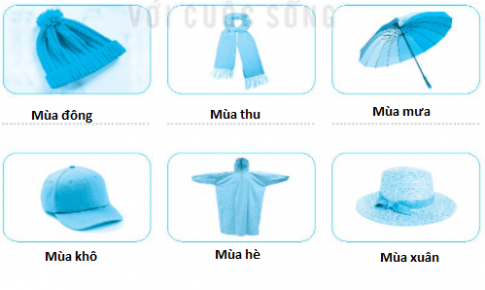 Bài 9. Chọn các cụm từ: Mùa xuân, Mùa hè, Mùa thu, Mùa đông hay Mùa mưa, Mùa khô và viết vào chỗ (...) dưới mỗi hình cho phù hợp.