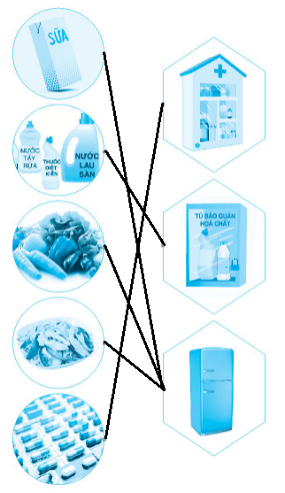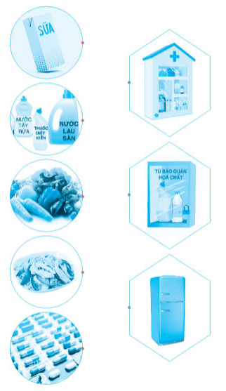 Bài 5. Nối hình đồ dùng, thức ăn, đồ uống với nơi cất giữ, bảo quản phù hợp để đảm bảo an toàn.