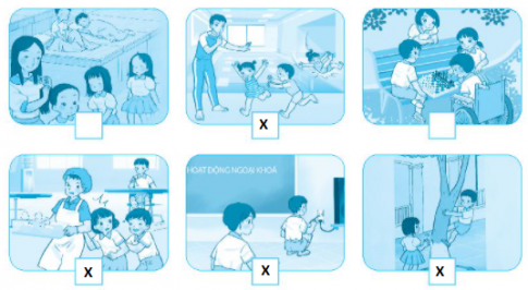 Bài 2. Đánh dấu X vào ô trống dưới hình thể hiện tình huống dễ gây nguy hiểm, rủi ro cho bản thân và người khác.